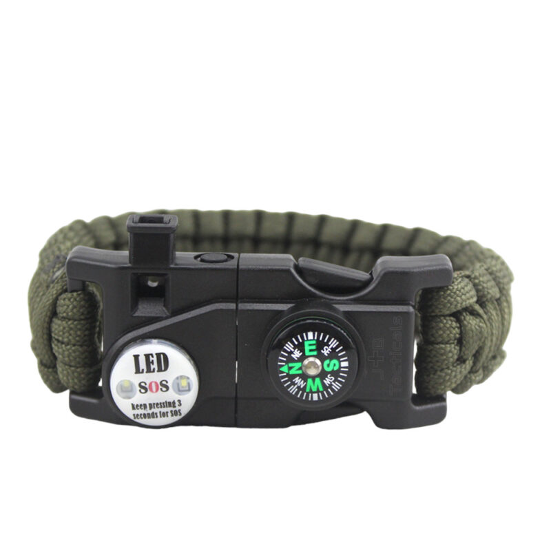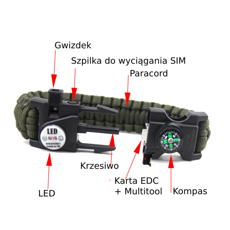 • Opaska z paracord: Około 3,2 metra paracordu, który może posłużyć jako lina ratunkowa, linka do zbudowania schronienia lub inne awaryjne zastosowania.