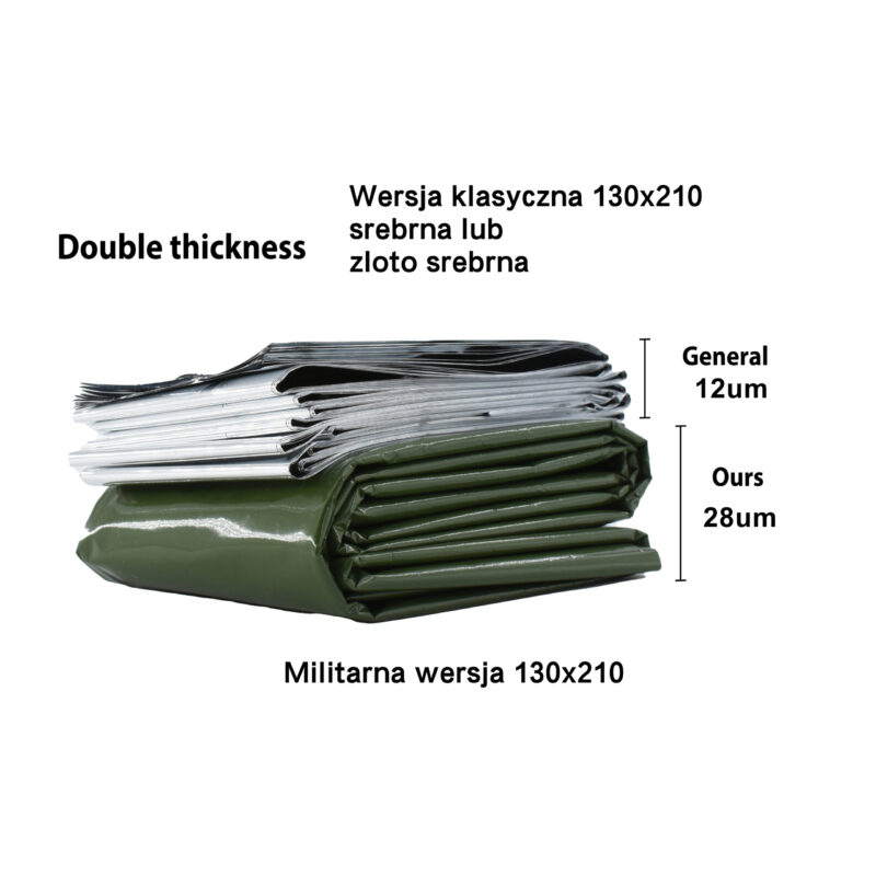 Oferujemy koc ratunkowy z folią NRC w wersji militarnej, który jest niezastąpiony w sytuacjach kryzysowych oraz podczas wypraw survivalowych i turystycznych. Nasza folia NRC ma dwukrotnie większą grubość niż standardowa folia o grubości 12μm – nasza wersja ma 28μm, co zapewnia maksymalną ochronę przed utratą ciepła i wilgocią. Koc ma rozmiar 130×210 cm, dzięki czemu zapewnia ochronę całego ciała. Kolor zielony wojskowy doskonale nadaje się do kamuflażu w terenie, co czyni go idealnym wyborem dla żołnierzy, miłośników strzelectwa, wycieczek, wypraw survivalowych i turystów.