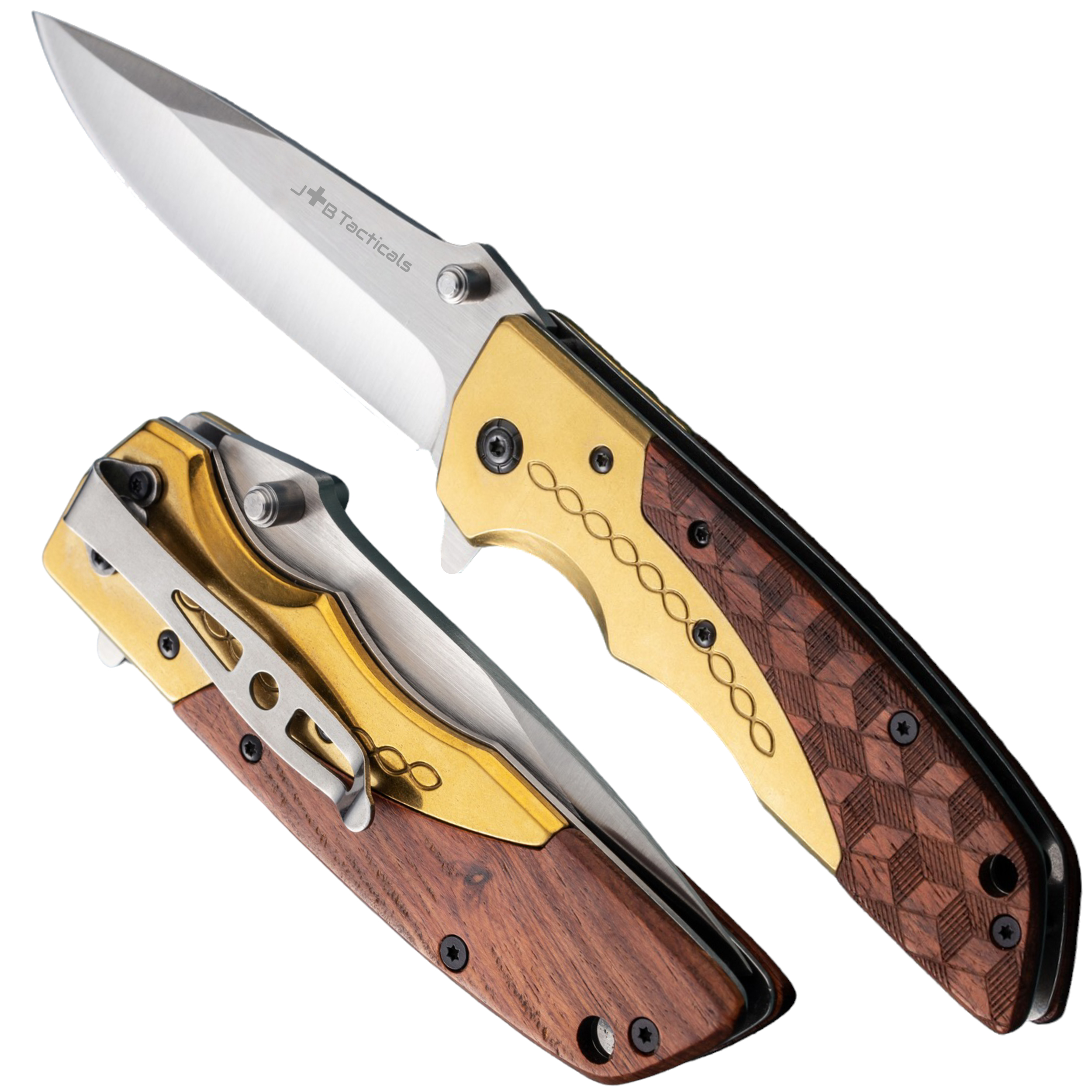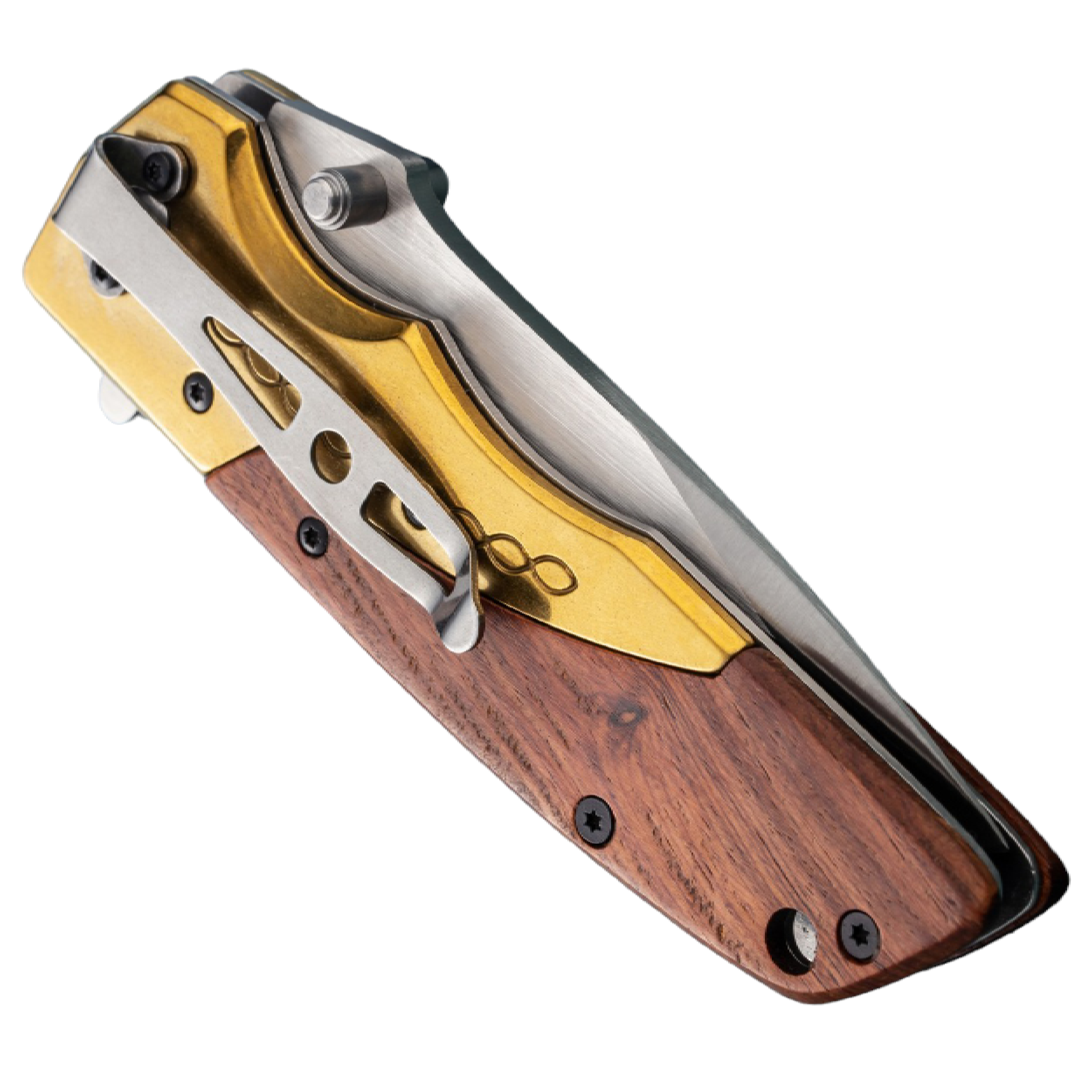 Nóż JB Tacticals JB-13 nie tylko zachwyca jakością wykonania, ale także niezwykłym wyglądem. Jego rękojeść to prawdziwe dzieło sztuki, połączenie złotej stali nierdzewnej i pięknego drewna. Ta unikalna kombinacja materiałów nadaje nożowi wyjątkowego blasku i prestiżu. Drewno, ozdobione oryginalnym wzorem, zapewnia nie tylko piękny wygląd, ale także ergonomiczny chwyt. To połączenie luksusu i funkcjonalności sprawia, że ten nóż wyróżnia się spośród innych.