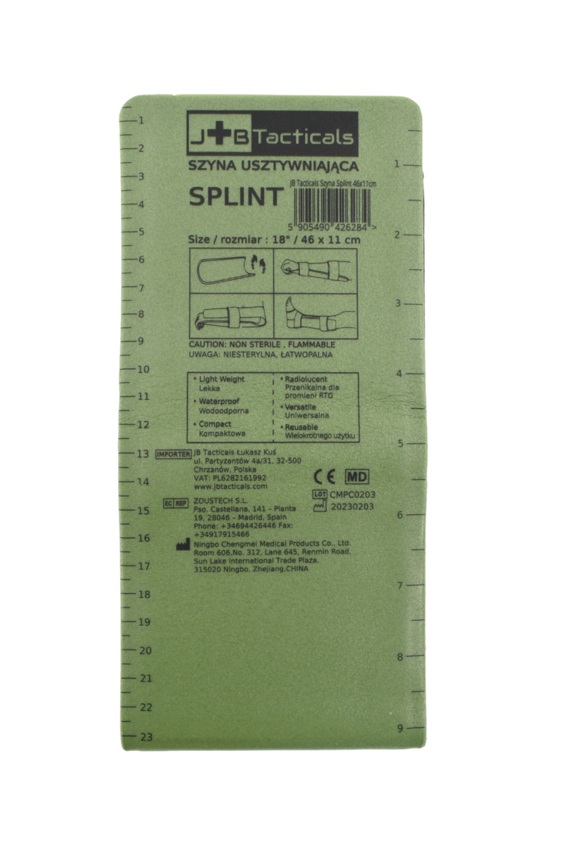 Szyna JB Tacticals Splint to rodzaj szyny typu splint, która składa się z giętkiego rdzenia aluminiowego pokrytego pianką EVA (octan winylu i etylenu), co zapewnia jej elastyczność i lekkość. Szyna JB jest stosowana do unieruchomienia urazów kończyn, w tym złamań, zwichnięć lub skręceń.